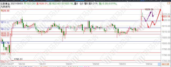 日线在阳光下收官,但最近一直在波动上涨,阳线后面都有修正,所以下周市场如何开盘我们会关注。继续多做一点没问题,只是一个点的问题。小时线在1824支持,顶部和底部过渡在1823。这是正常的趋势。如果大盘跌破1823,准确来说应该是1821,周一震荡的概率会比较大,估计会到达非农上升点1813附近。周五的低点是1808。只要市场没有破位或者震荡看涨,未来一旦跌破1808,这波多头就结束了,还会有大的下跌。甚至可以追溯到1800-1795年。