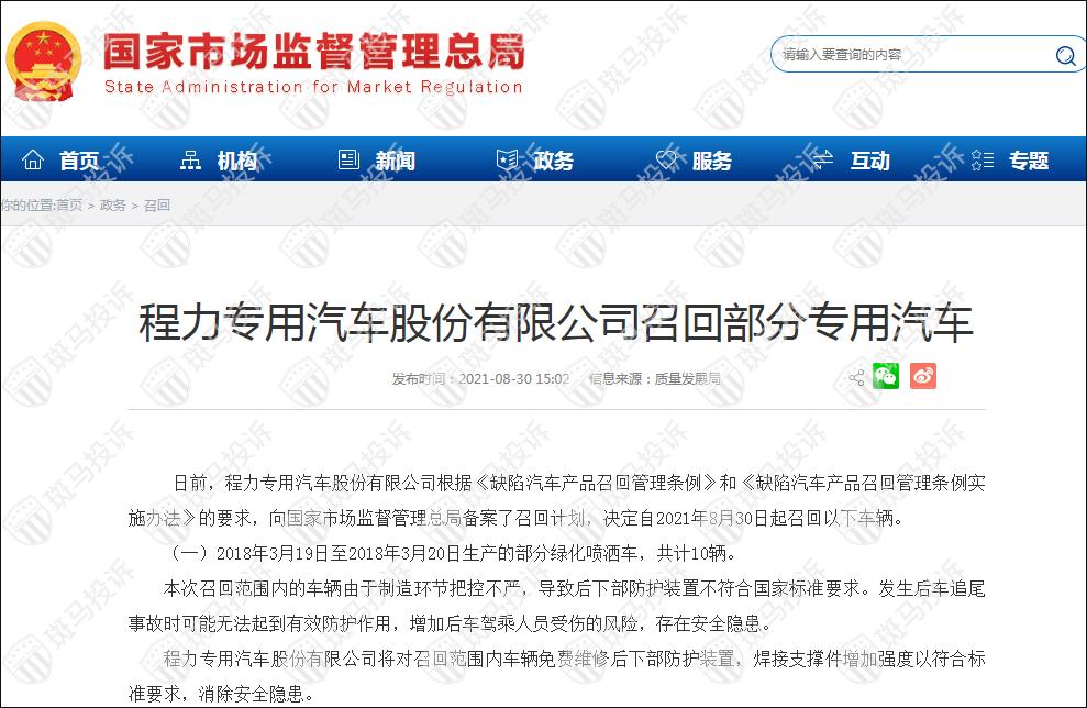 8月30日,国家市场监管总局发布“李成专用汽车有限公司召回部分专用汽车”的公告。