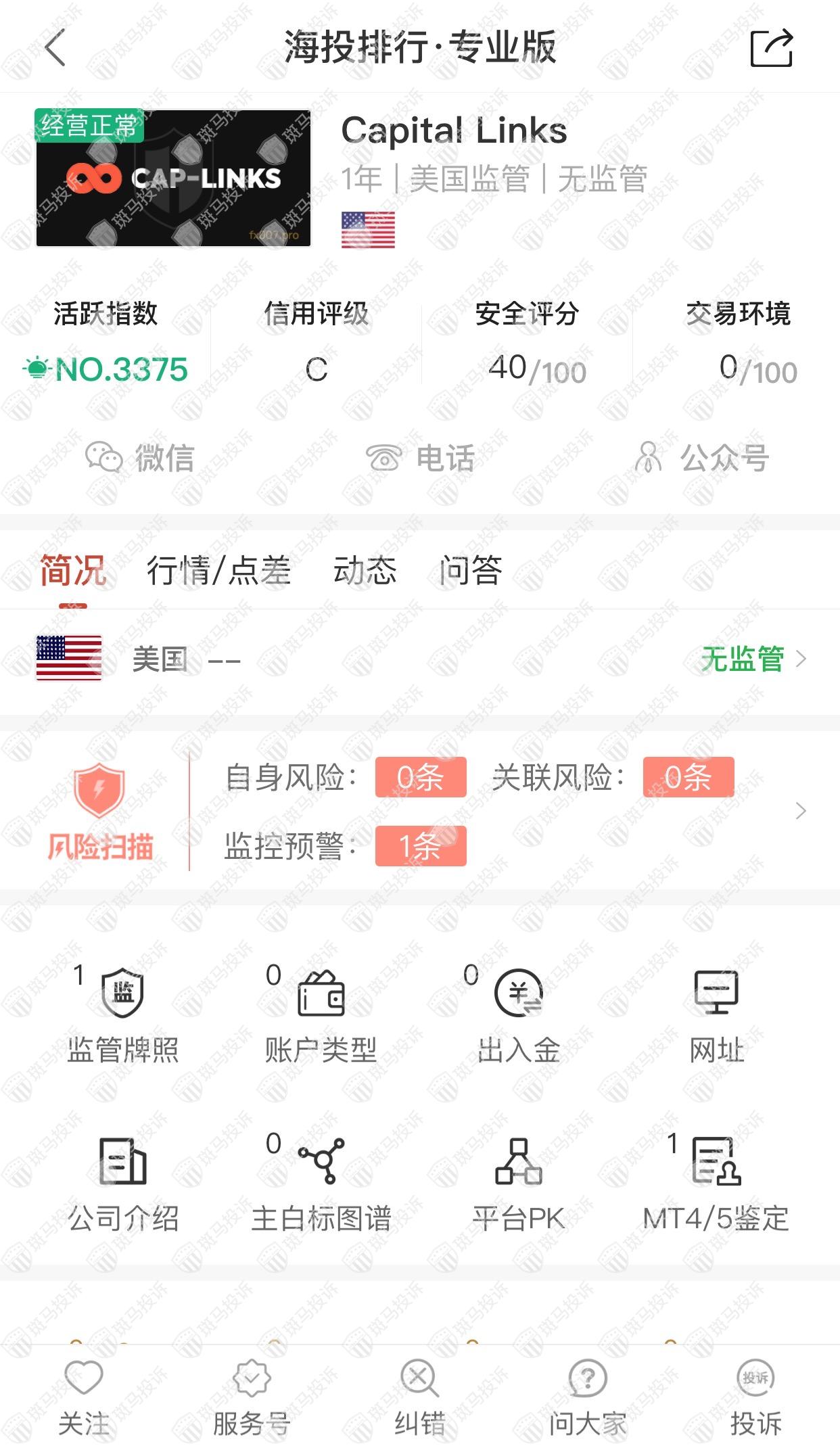 这家平台叫Capital Links,成立于2021年,全球排名3375名,目前无监管,没有外汇牌照,不能做外汇保证金交易,风险扫描显示1条风险,投资者资金安全无保障。