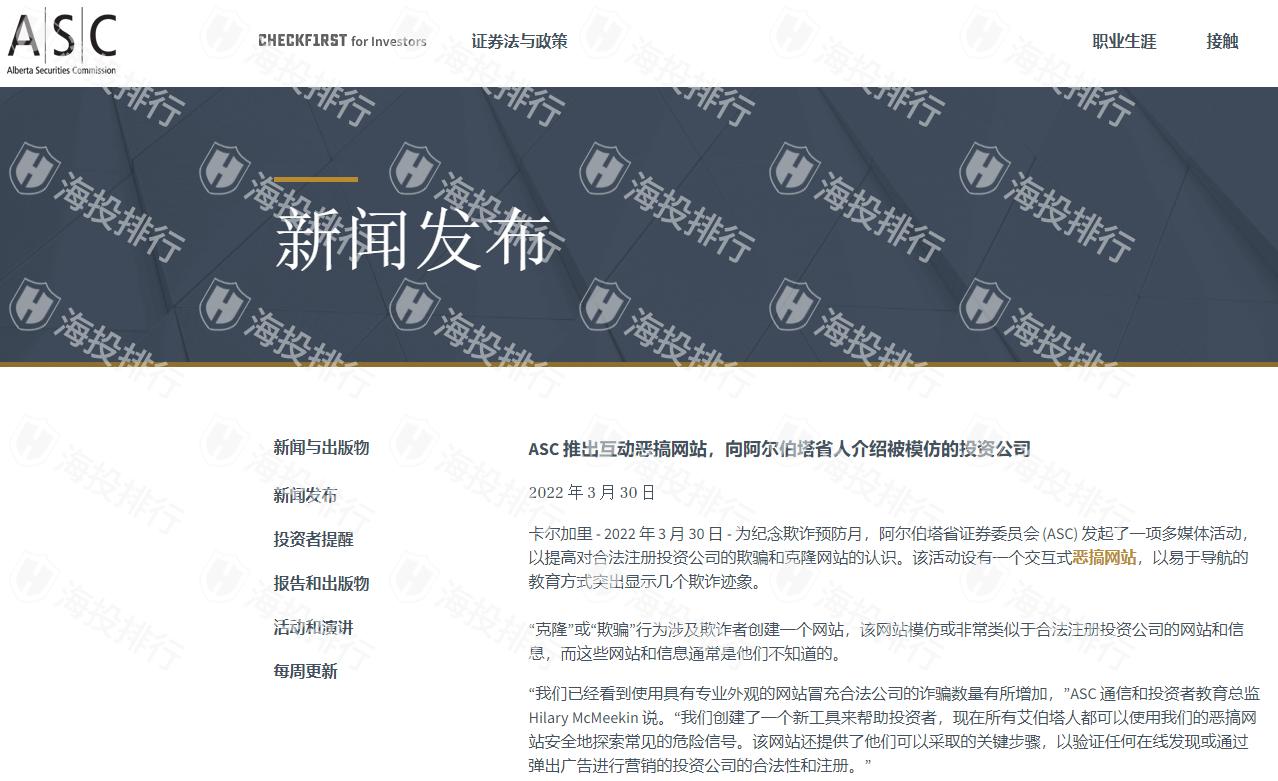 艾伯塔省证券委员会(Alberta Securities Commission,简称ASC)发起了一个多媒体活动,以提高对合法注册投资公司的欺骗和克隆网站的认识。