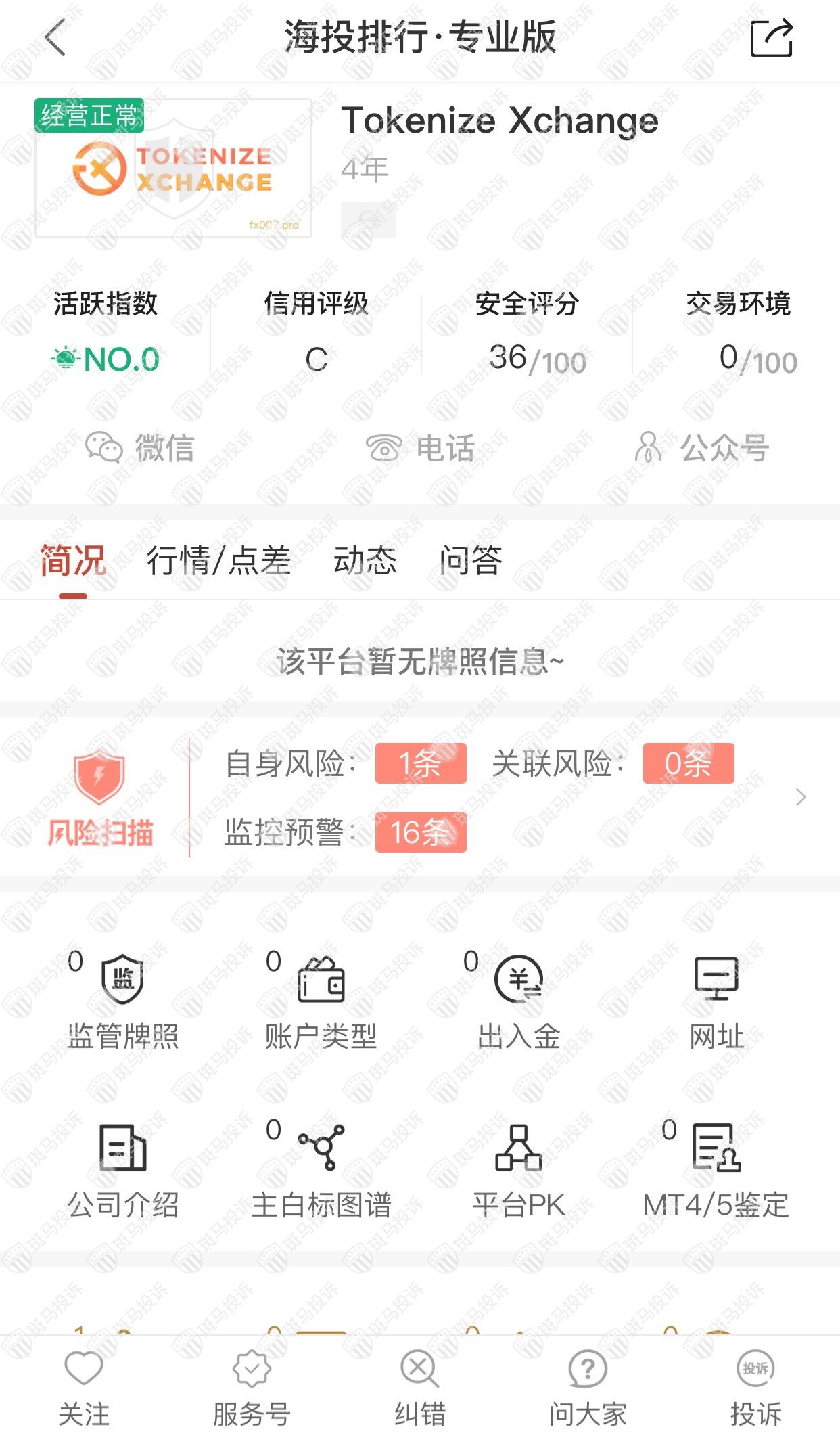 这家平台叫Tokenize Xchange,成立于2017年,全球无排名,目前无监管,没有外汇牌照,不能做外汇保证金交易,风险扫描显示17条风险,投资者资金安全无保障。