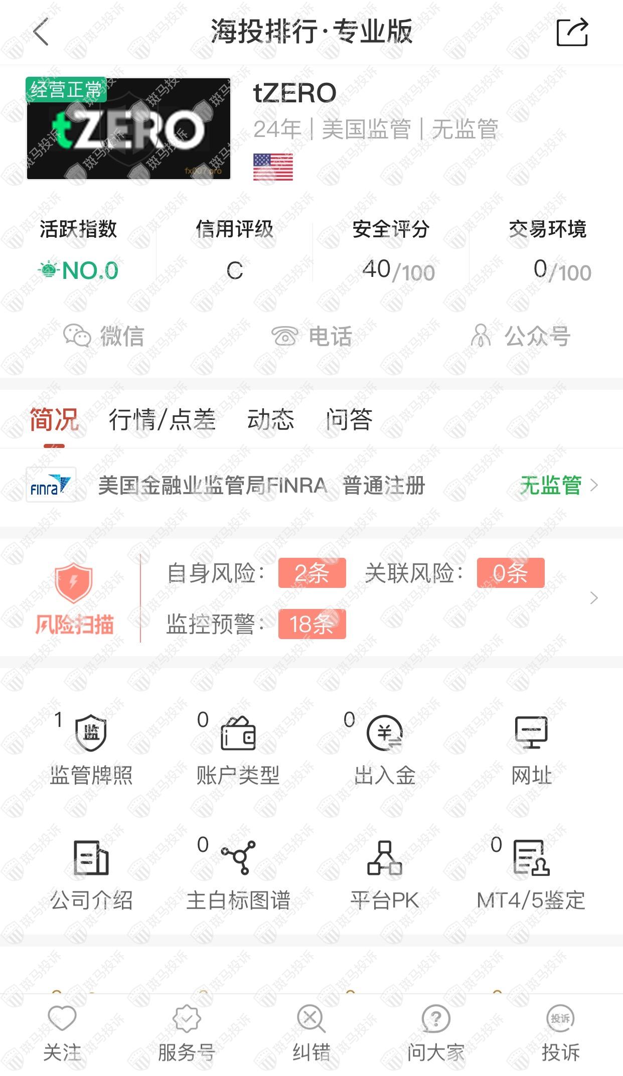 这家平台叫tZERO,成立于1998年,无全球排名,目前无监管,没有外汇牌照,不能做外汇保证金交易,风险扫描显示20条风险,投资者资金安全无保障。