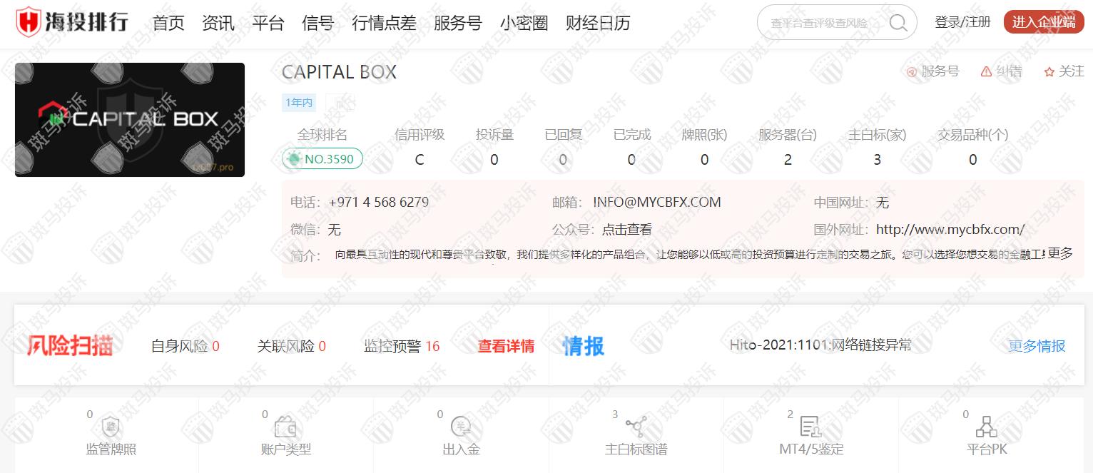 CAPITAL BOX成立于2020年,全球排名3590名,目前无监管,没有外汇牌照,不能做外汇保证金交易,风险扫描显示16条风险,投资者资金安全无保障。
