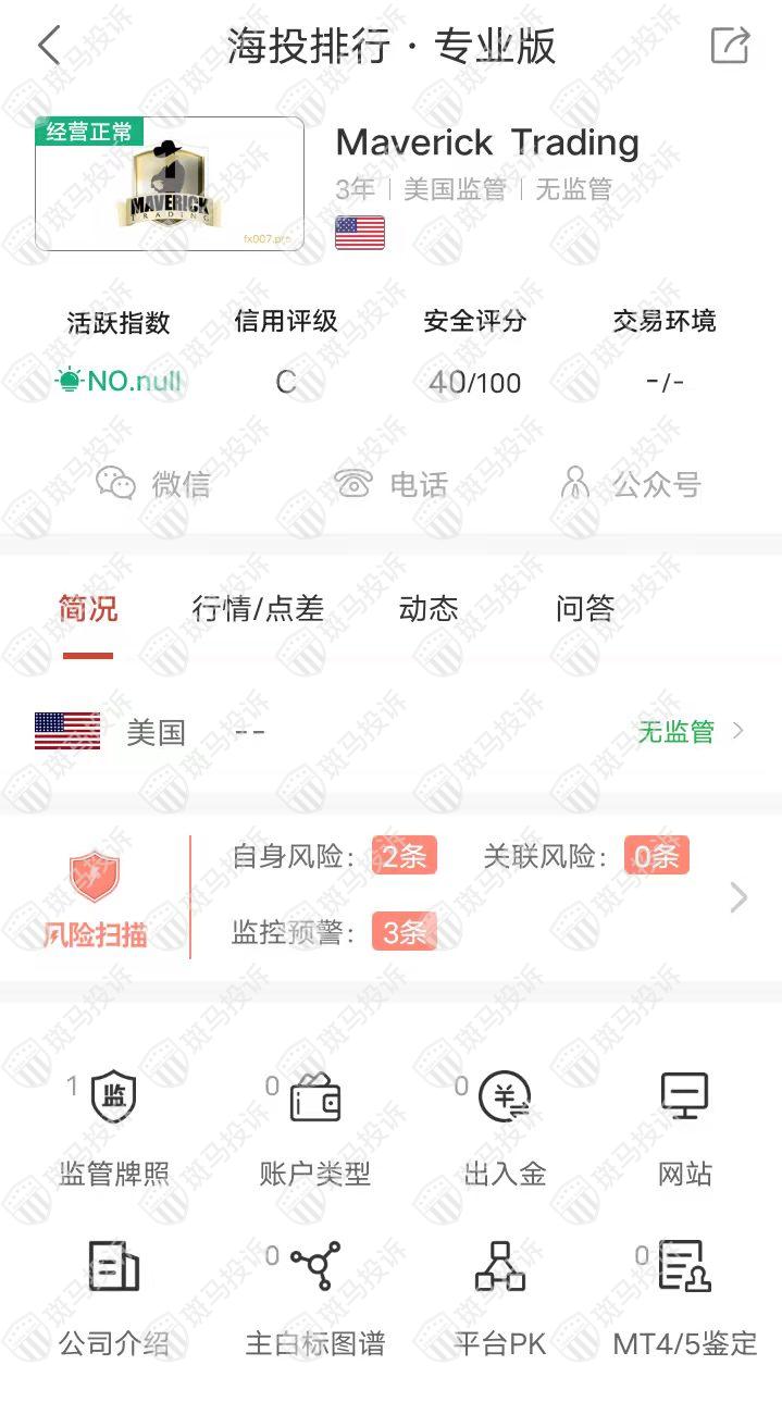 这家平台叫Maverick Trading,成立于2020年,目前无监管,没有外汇牌照,不能做外汇保证金交易,风险扫描显示5条风险,投资者资金安全无保障。