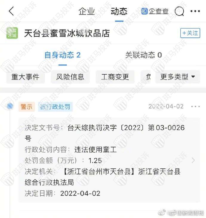 近日,一则关于蜜雪冰城使用童工被罚的消息冲上热搜,该店被当地相关部门做出行政处罚,并处罚金1.25万元。据悉,在4月2日,相关媒体爆出查询到天台县蜜雪冰城饮品店有一条行政处罚,处罚的理由是:违法使用童工,被浙江省天台县综合执法局罚款1.25万元。