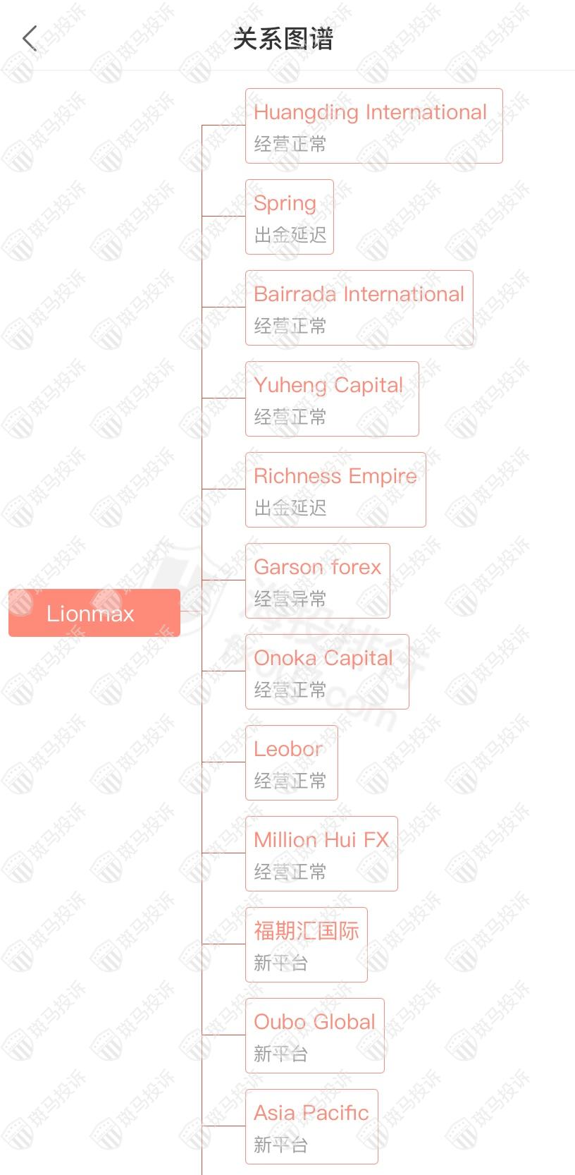 主白标关系显示Lionmax平台和26家平台是一家公司,从他们的服务器地址,网站的模板来看,都可以看出来相似的地方。其中Spring、Richness Empire出金延迟;Garson forex经营异常;Actgold停止经营。
