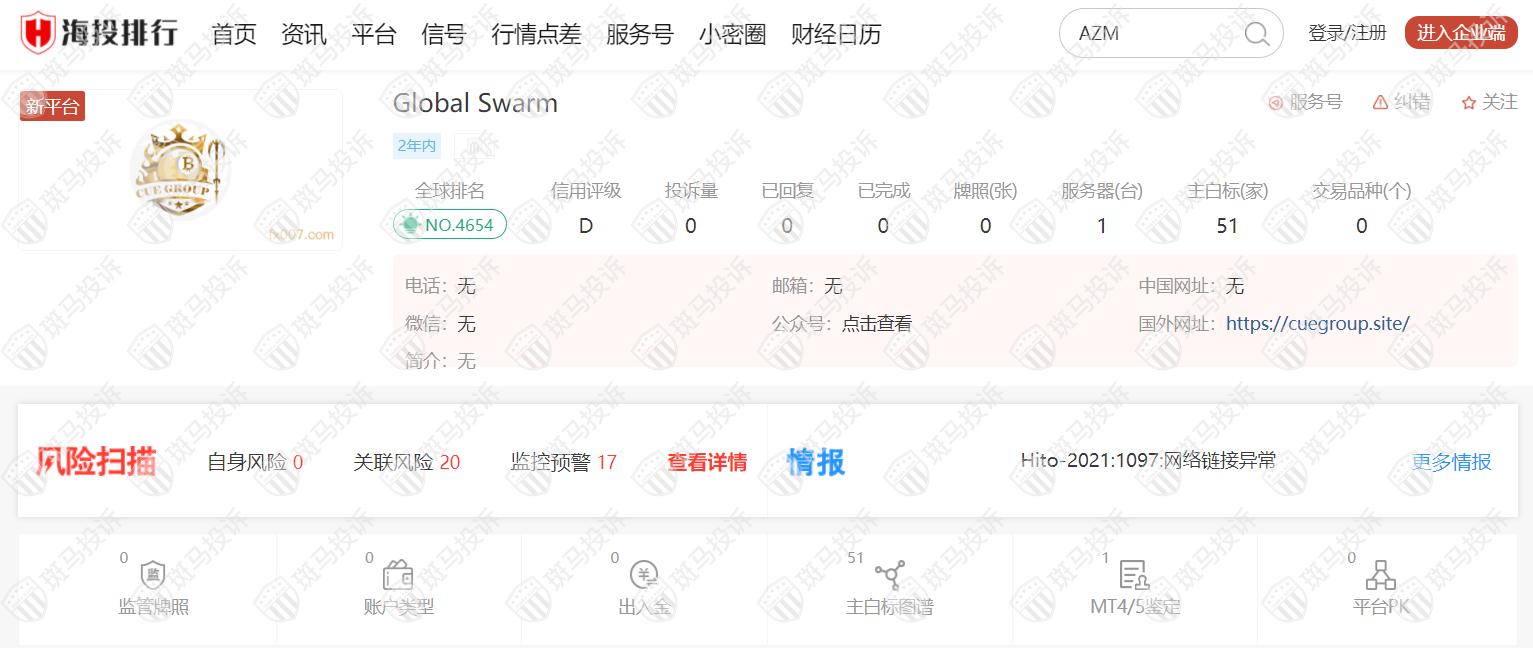 这家平台叫Global Swarm,成立于2020年,全球排名4654名,目前无监管,没有外汇牌照,不能做外汇保证金交易,风险扫描显示17条风险,投资者资金安全无保障。