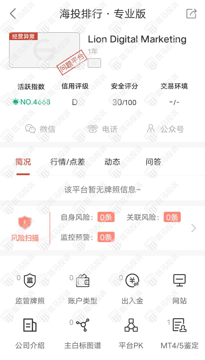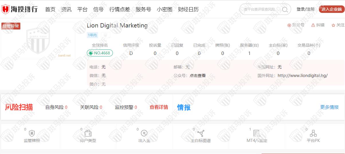 这家平台叫Lion Digital Marketing,成立于2021年,全球排名4668名,目前无监管,没有外汇牌照,不能做外汇保证金交易,风险扫描显示0条风险,投资者资金安全无保障。