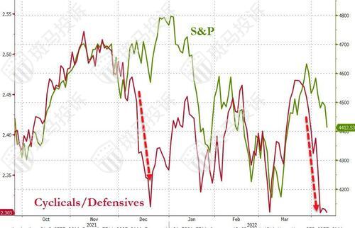 我们有了一个极端分化的例子,美股内部结构表现出严重的增长担忧恐慌,而债券和标普500指数走势则反映增长尚可,其中美国债市则显示经济将保持强劲。
