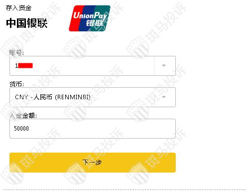 4、选择要入金的交易账号,输入入金金额,点击下一步。