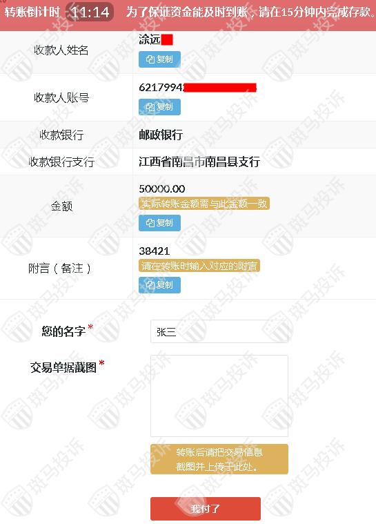 6、生成财务渠道户头口,使用手机网银或者支付宝转账银行卡,转账至此财务渠道账号,一定要填写备注,并截图转账单。填写自己的名字,不支持第三方入金,上传转账截图,点击我付了。