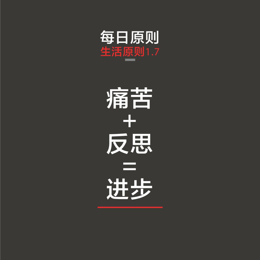 人避免不了痛苦,尤其是在追求雄心勃勃的目标时。不管你相信与否,如果以正确的态度对待痛苦,感到痛苦就是你的幸运,因为这是一个信号——你需要寻找解决方案以便继续前进。如果你能形成一种条件反射,面对精神痛苦时能够自动地反思痛苦,而不是躲避痛苦,你就能够快速地学习和进化。直面那些由问题、错误和弱点导致的痛苦现实,会大幅提高你的效率,我相信,只要你看到了这种做法的好处,就不会再想以其它方式行事了。你只需要养成这样做的习惯。