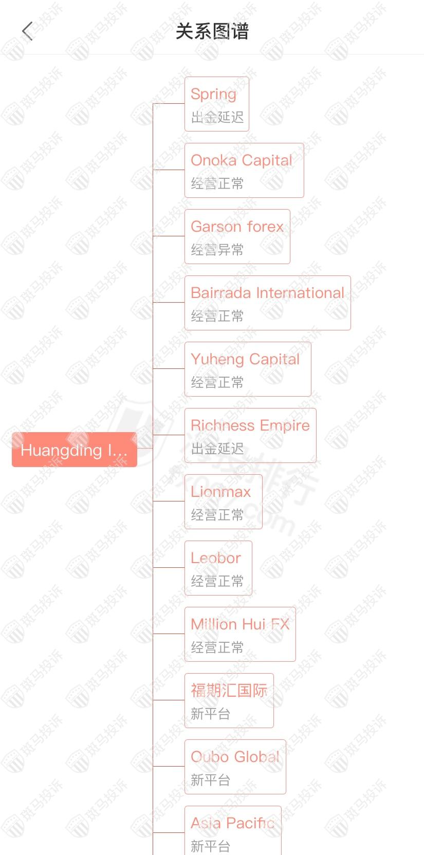主白标关系显示Huangding International平台和26家平台是一家公司,从他们的服务器地址,网站的模板来看,都可以看出来相似的地方。其中Spring 、Richness Empire出金延迟;Garson forex经营异常;Actgold停止经营。