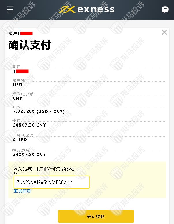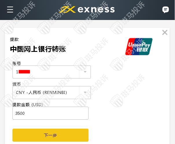 3、选择要出金的账号,货币默认CNY,输入要提现的金额,每次提款最低100¥,最高6900$,每天不限提款次数。