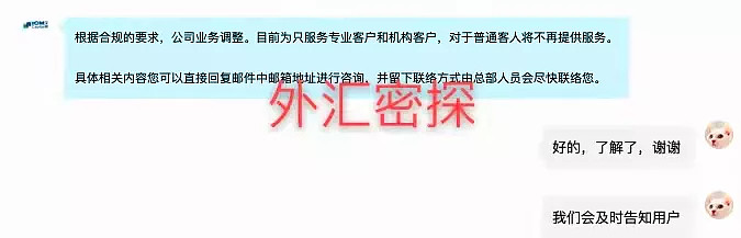 外汇密探紧急联系了平台客服,目前客服的反馈是等待英国销售来联系我们,并且明确告知:根据合规的要求,公司业务调整。目前为只服务专业客户和机构客户,对于普通客人将不再提供服务。具体相关内容您可以直接回复邮件中邮箱地址进行咨询,并留下联络方式由总部人员会尽快联络您。