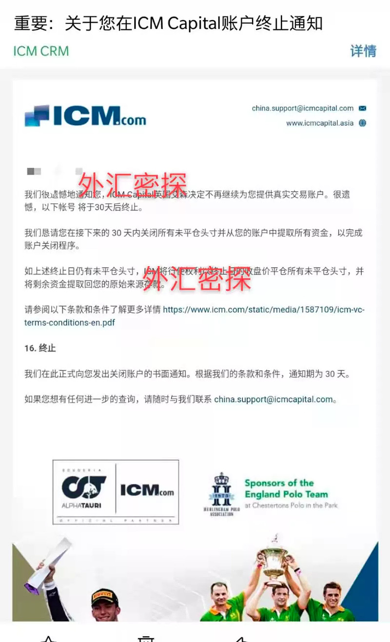 邮件内容显示:ICM Capital英国艾森决定不再继续为您提供真实账户,很遗憾,以下账号将于30天后终止。