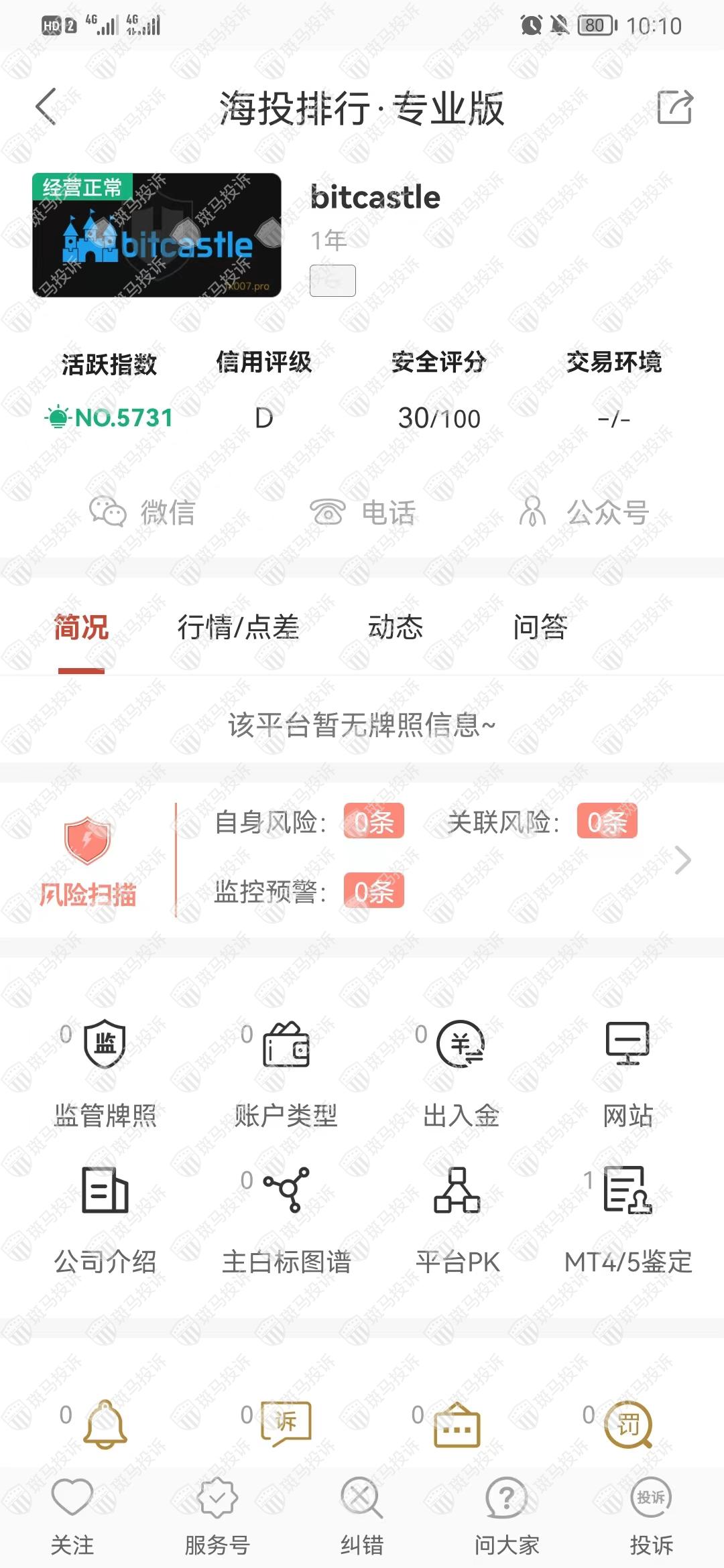 这家平台叫bitcastle,成立于2022年,全球活跃指数4299名,目前无监管,没有外汇牌照,不能做外汇保证金交易,风险扫描显示0条风险,投资者资金安全无保障。