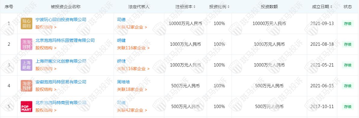 当天,POP MART斥资1亿元成立了Play Heart Return投资公司,该公司也是POP MART的全资子公司。值得一提的是,前不久对POP MART的投资非常动画化,也是一家投资公司。