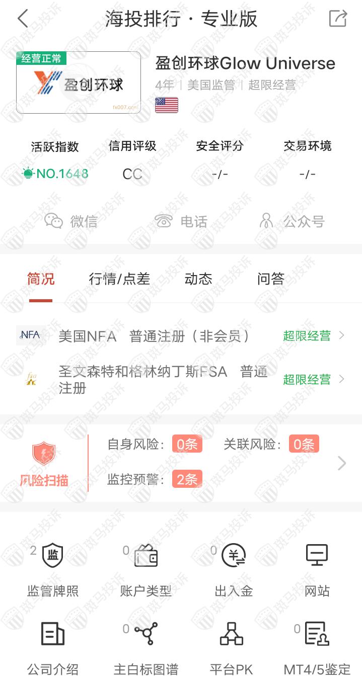 这家平台叫Glow Universe盈创环球,成立于2018年,全球排名1648名,目前有2个监管,分别是圣文森特和格林纳丁斯FSA和美国NFA,但是没有外汇牌照,不能做外汇保证金交易,风险扫描显示2条风险,投资者资金安全无保障。