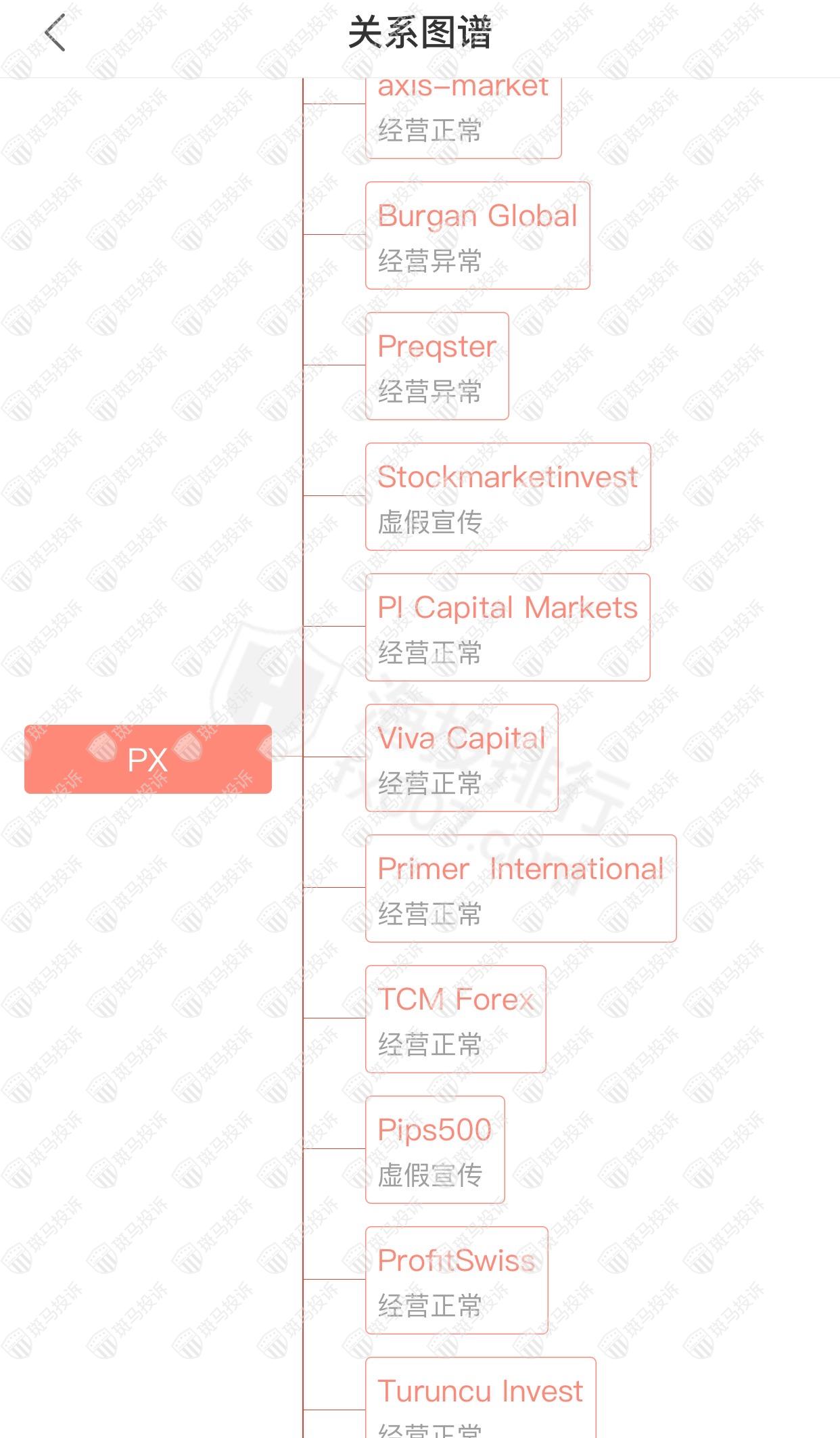 主白标关系显示,PX平台和18家平台存在关联,其中4家平台分别出现经营异常、虚假宣传的情况。