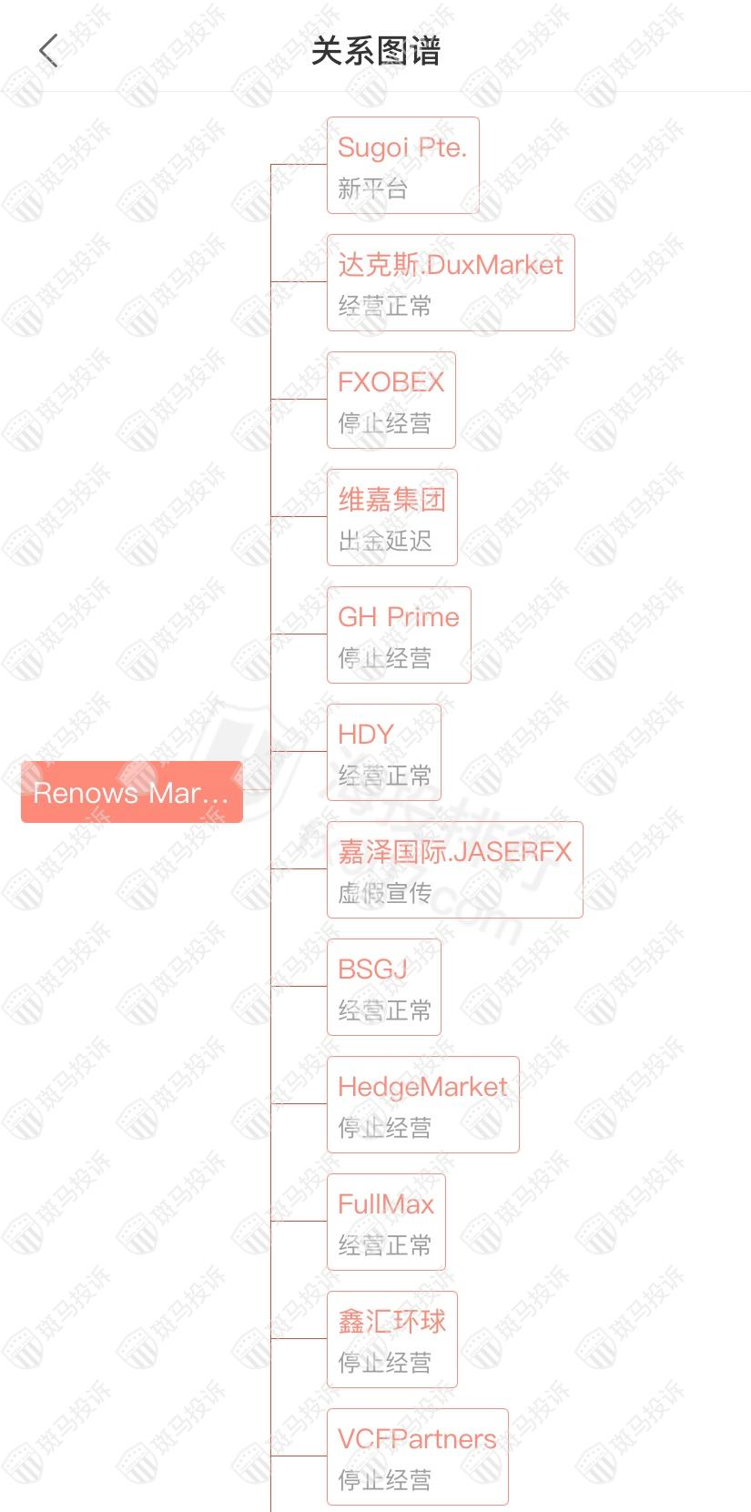 主白标关系显示Renows Markets平台和64家平台是一家公司,从他们的服务器地址,网站的模板来看,都可以看出来相似的地方。其中嘉泽国际.JASERFX虚假宣传;FXOBEX、GH Prime停止经营;维嘉集团出金延迟。