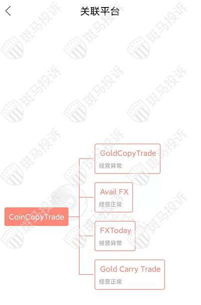 主白标关系显示,CoinCopyTrade平台目前和4家平台存在关联,其中FXToday和GoldCopyTrade这2家平台经营异常。