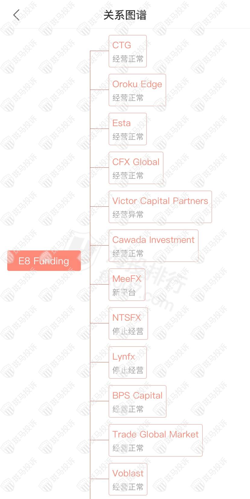 主白标关系显示E8 Fund3ing平台和33家平台是一家公司,从他们的服务器地址,网站的模板来看,都可以看出来相似的地方。其中Victor Capital Partners经营异常;NTSFX、Lynfx停止经营。