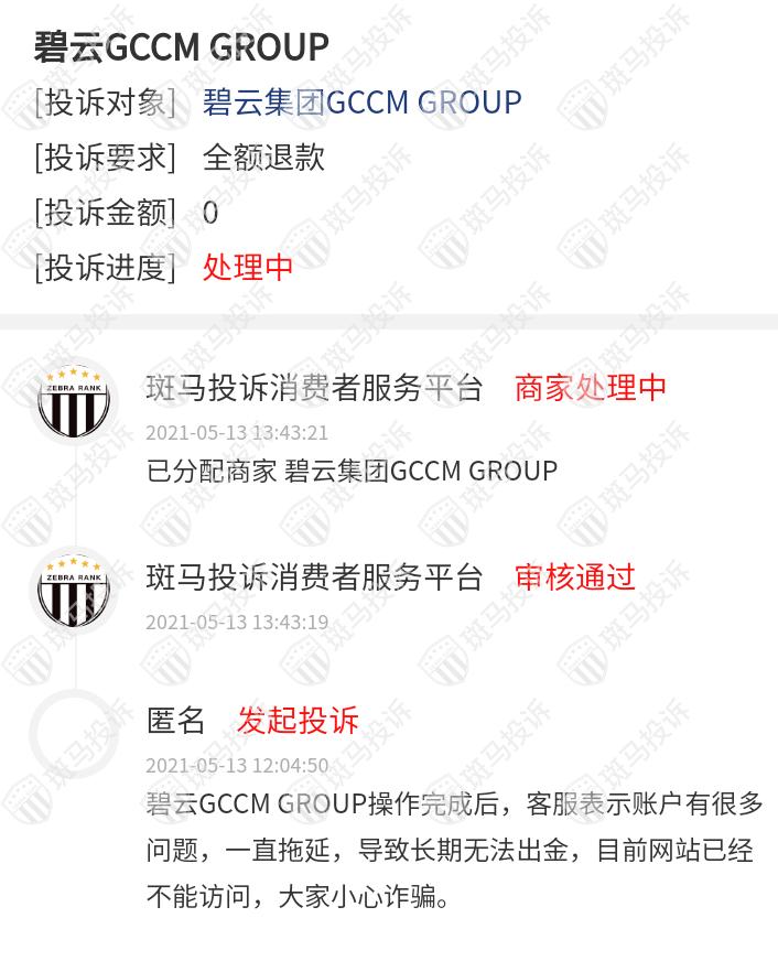 GCCM GROUP碧云集团平台目前在斑马投诉已收到1条投诉,因GCCM GROUP碧云集团客服一直,导致其客服无法出金,遭到用户的投诉。