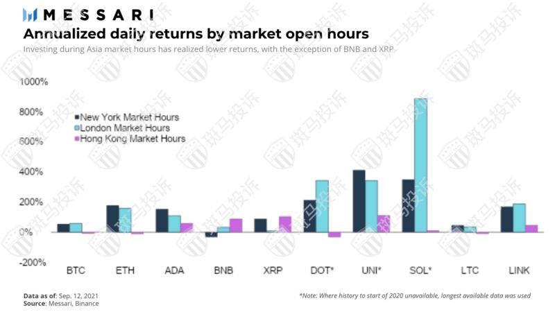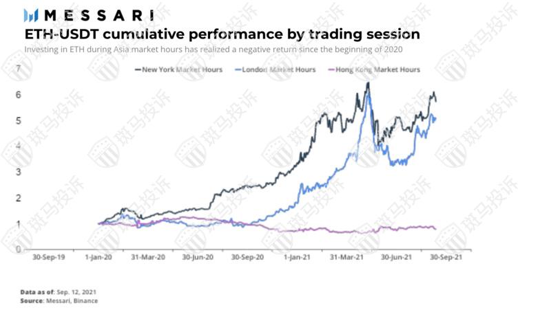 如果投资者自2020年初以来一直持有ETH,他们的初始投资将增加26倍以上(至2021年9月12日)。然而,如果同一位投资者只在香港市场交易时段持有ETH,他们反而会实现负回报。相反,如果他们在纽约或伦敦市场交易时段持有ETH,他们仍然会获得很大比例的回报。