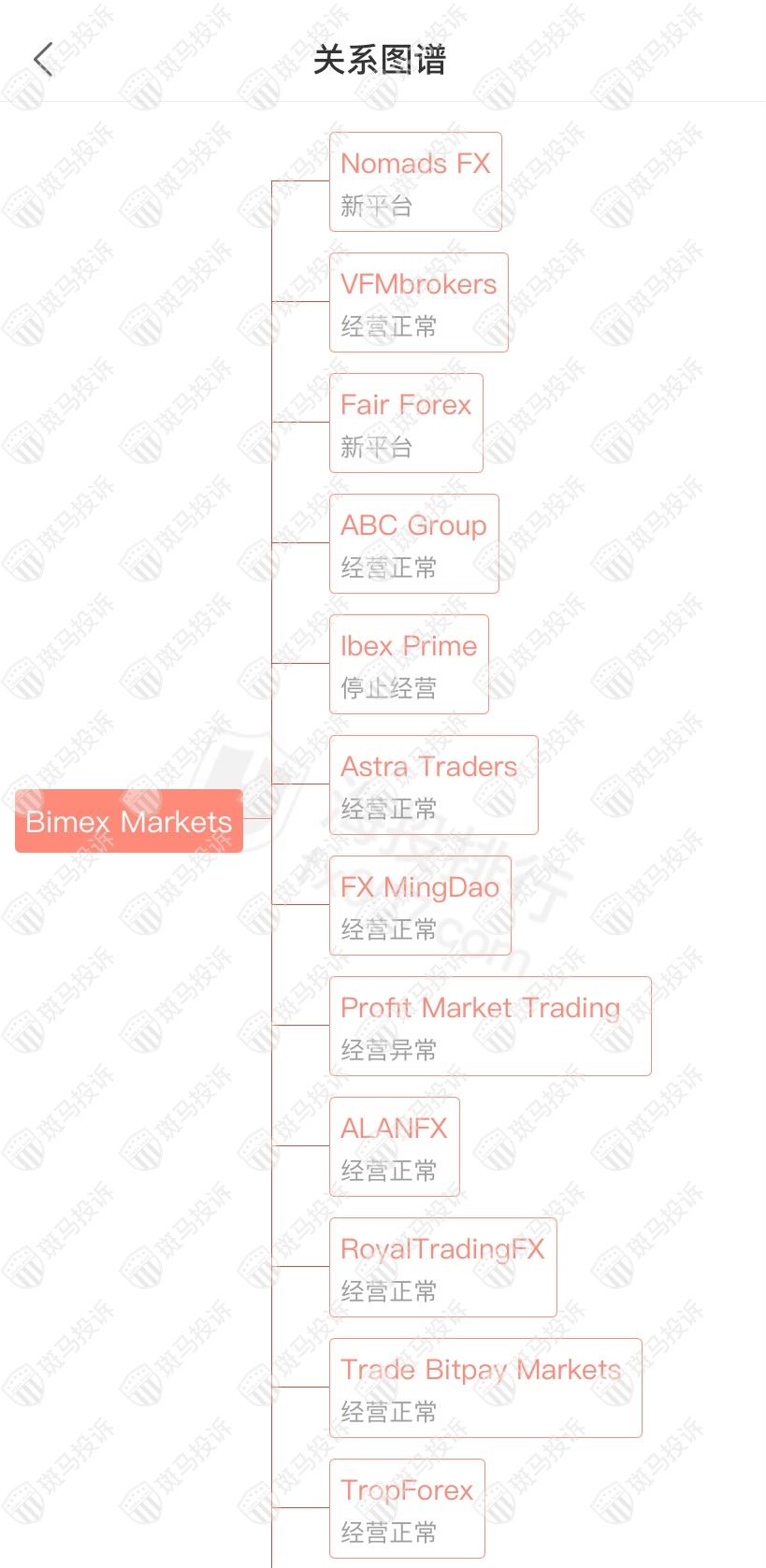 主白标关系显示Bimex Markets平台和20家平台是一家公司,从他们的服务器地址,网站的模板来看,都可以看出来相似的地方。其中Profit Market Trading经营异常;Ibex Prime、Carmen FX停止经营。