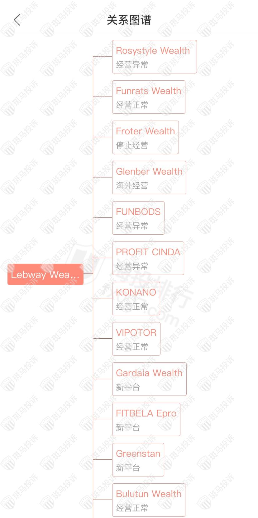 主白标关系显示Lebway Wealth平台和16家平台是一家公司,从他们的服务器地址,网站的模板来看,都可以看出来相似的地方。其中Rosystyle Wealth、FUNBODS、PROFIT CINDA经营异常;Froter Wealth停止经营。