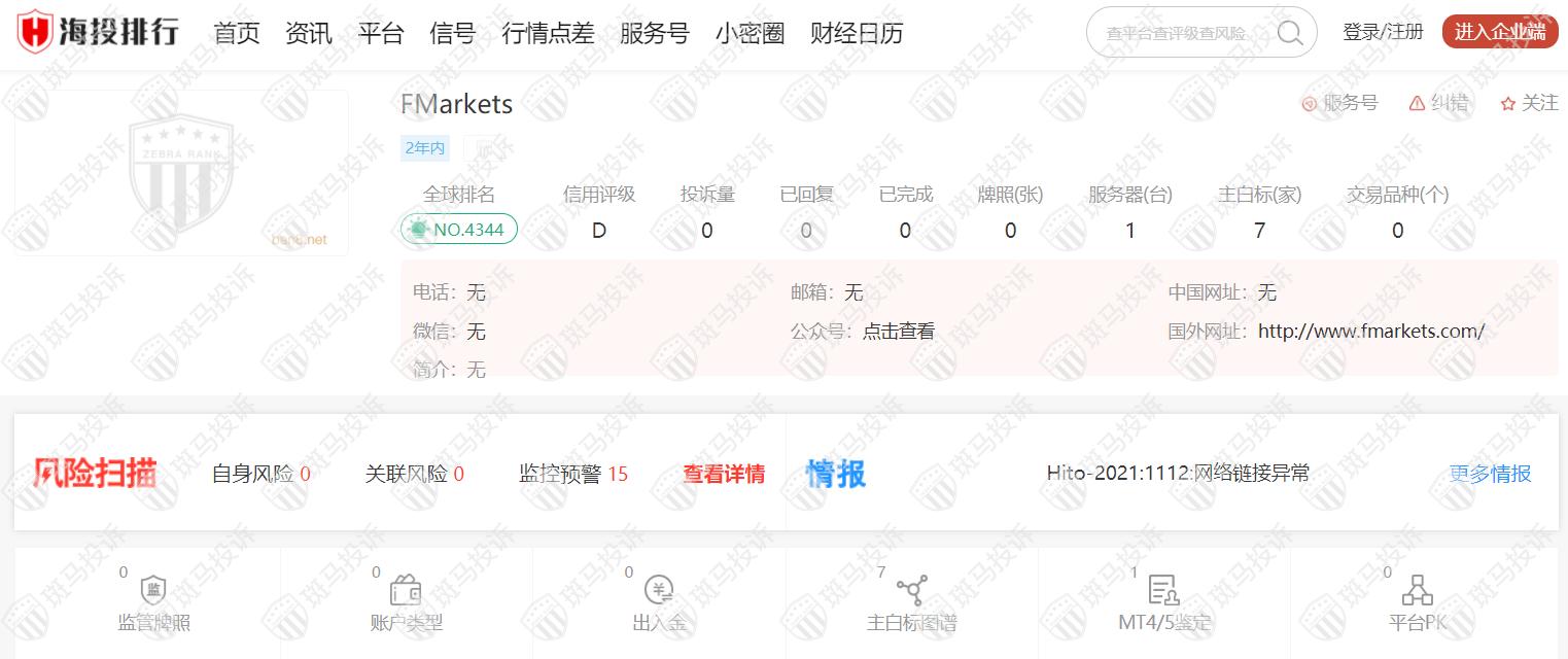 这家平台叫FMarkets,成立于2020年,全球排名4344名,目前无监管,没有外汇牌照,不能做外汇保证金交易,风险扫描显示15条风险,投资者资金安全无保障。