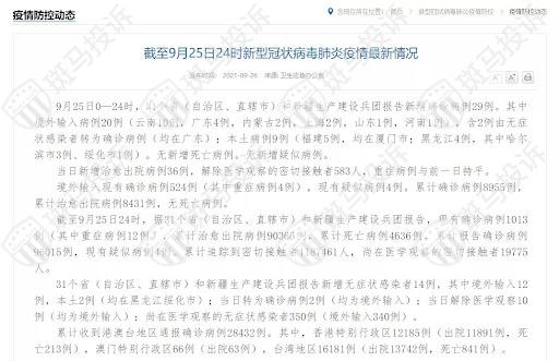 9月25日0—24时,31个省(自治区、直辖市)和新疆生产建设兵团报告新增确诊病例29例。