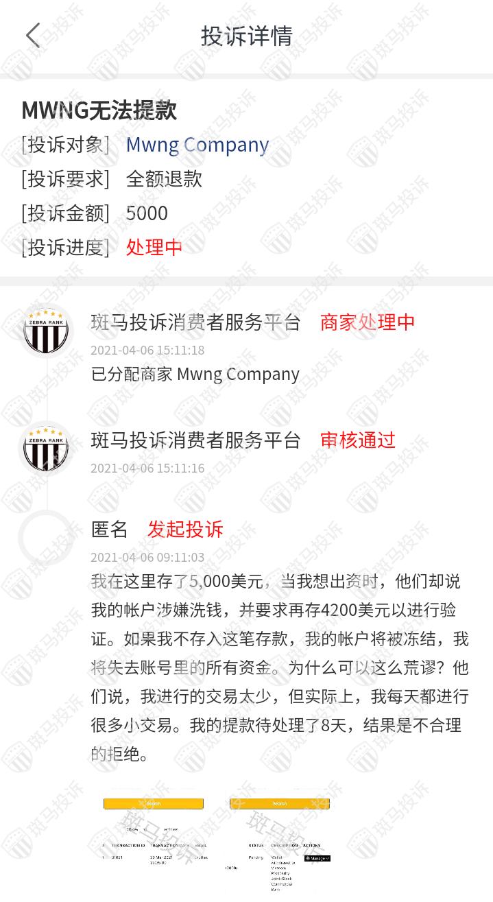 关联Mwng Company平台目前在斑马投诉已收到1条投诉。