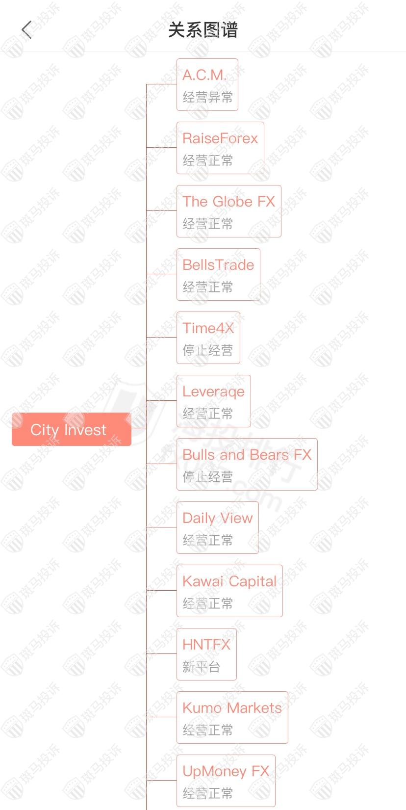 主白标关系显示City Invest平台和25家平台是一家公司,从他们的服务器地址,网站的模板来看,都可以看出来相似的地方。其中A.C.M经营异常;Time4X、Bulls and Bears FX停止经营。