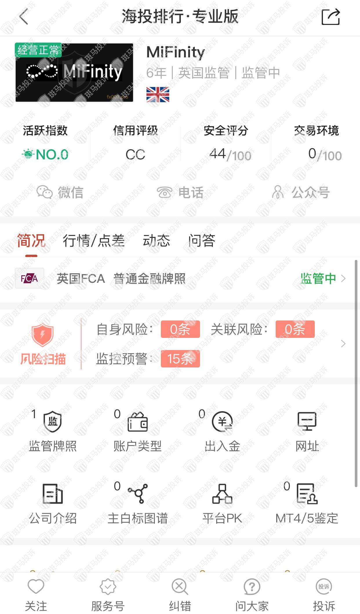 这家平台叫MiFinity,成立于2016年,无全球排名,目前有英国FCA监管,有外汇牌照,能做外汇保证金交易,风险扫描显示15条风险,投资者资金安全有保障。