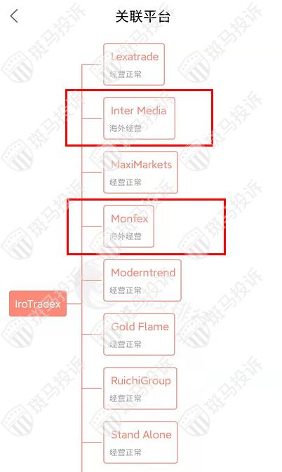 主白标关系显示,IroTradex平台目前和14家平台存在关联,其中Monfex和Inter Media平台海外经营。