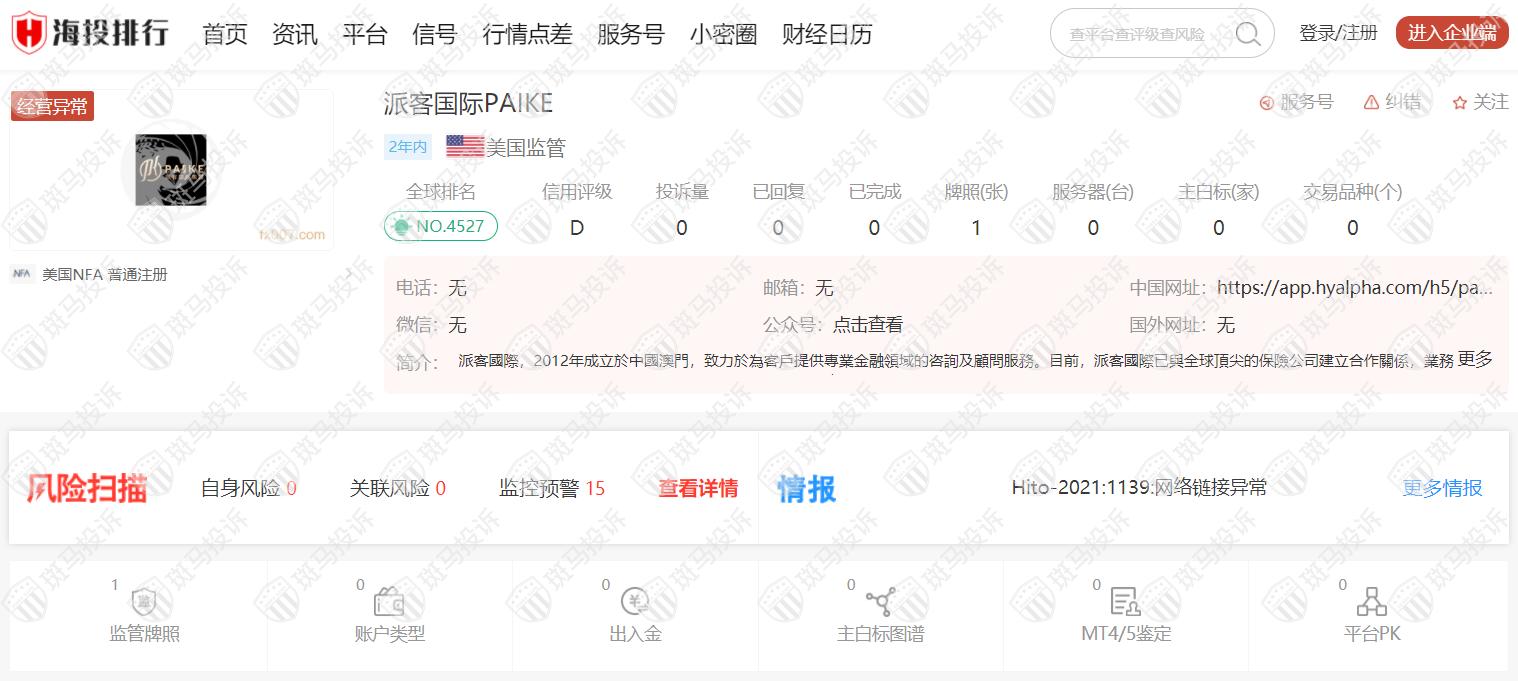 这家平台叫PAIKE派客国际,成立于2020年,全球排名4527名,目前受美国NFA监管,但没有外汇牌照,不能做外汇保证金交易,并且处于经营异常状态,风险扫描显示15条风险,投资者资金安全无保障。