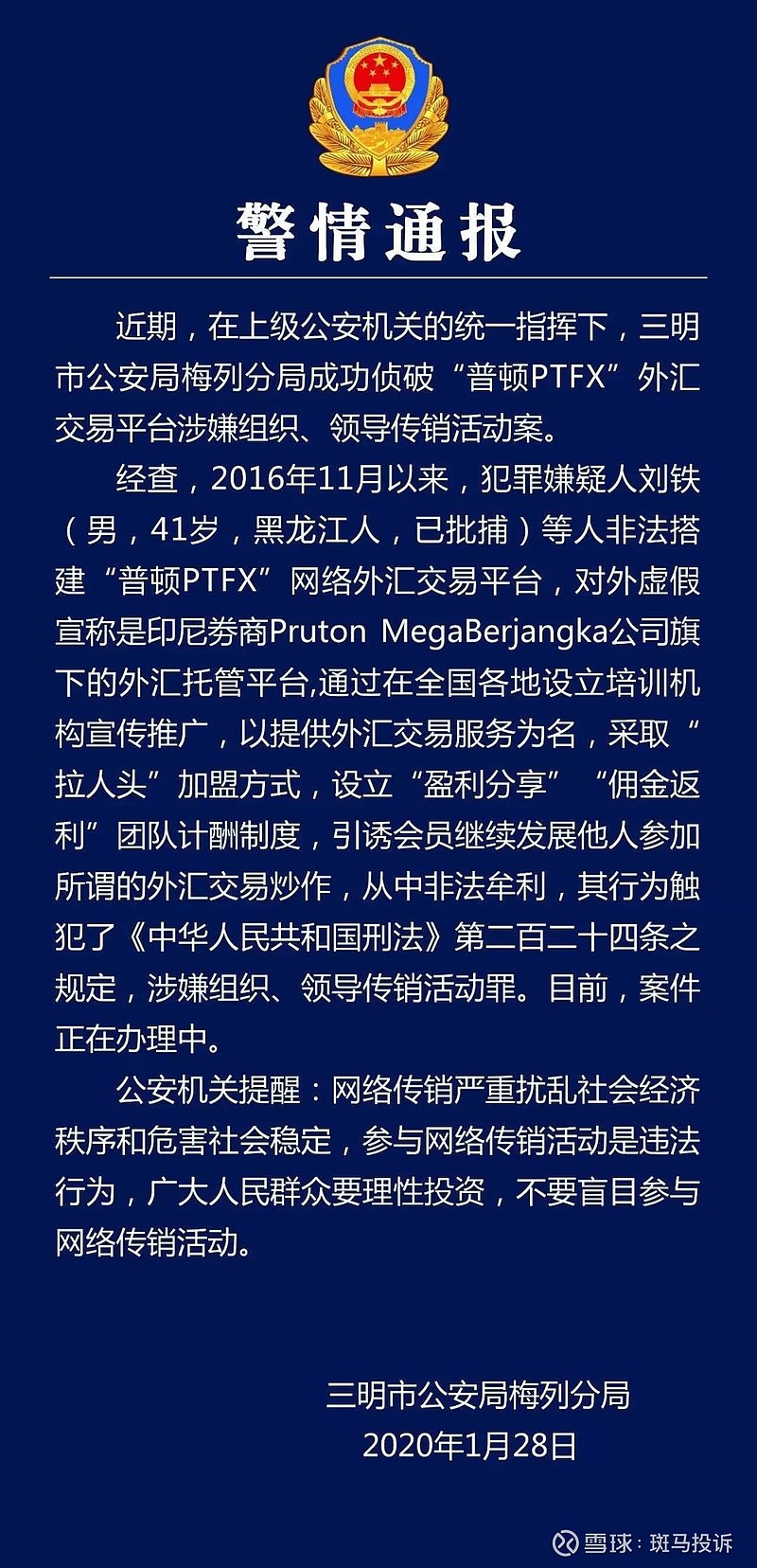 三明市公安局梅列分局在其官微发布信息称:成功侦破“普顿PTFX”外汇交易平台涉嫌组织、领导传销活动案(详情见图片)。