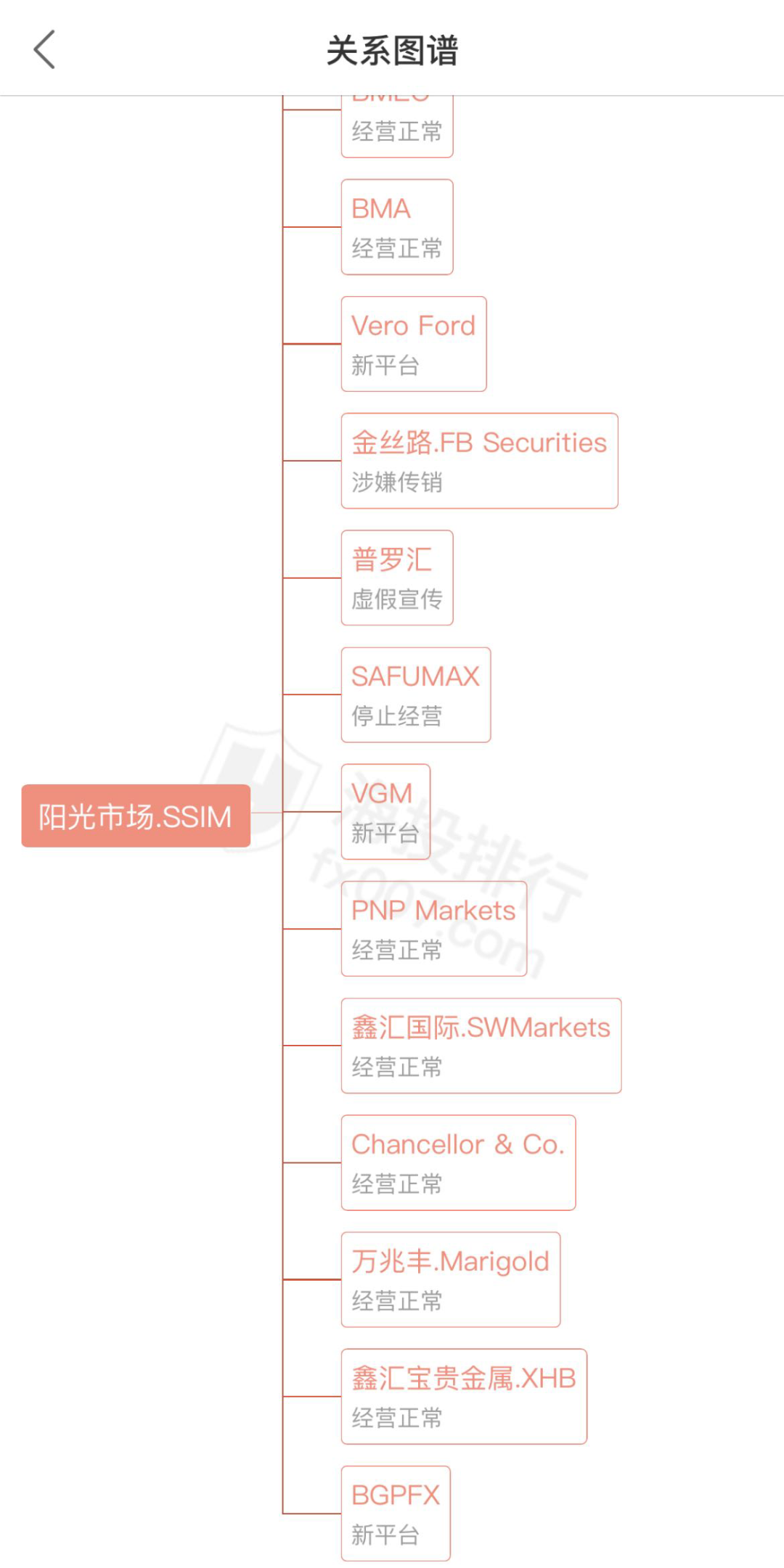SSIM阳光市场主白标关系有22家,其中包含多家无法出金、已跑路的平台,如:金丝路FB Securities、易集团EasyGroupTrading、SAFUMAX、普罗汇,这些平台都是同一诈骗集团新开和开国的平台,有在里面投资的投资者,请及时退出。