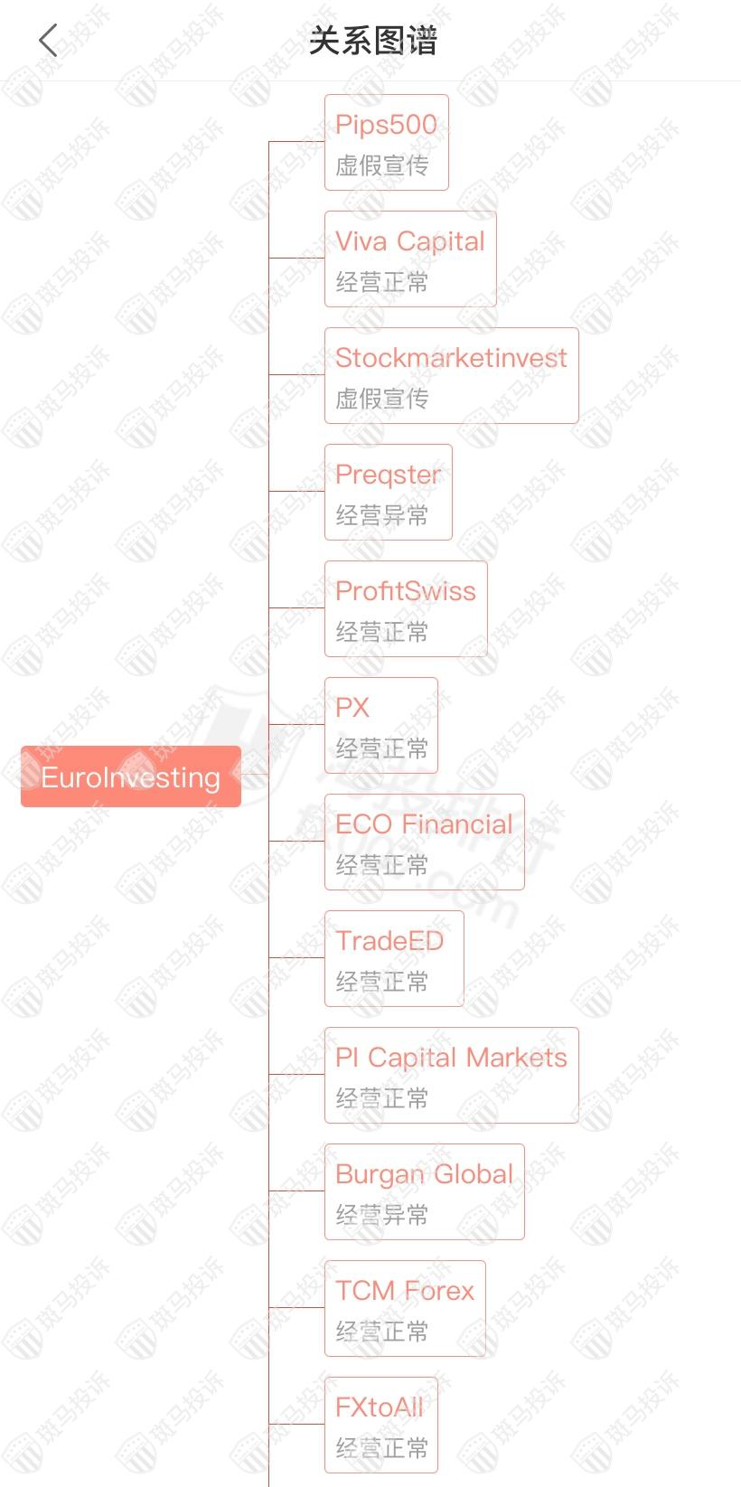 主白标关系显示EuroInvesting平台和16家平台是一家公司,从他们的服务器地址,网站的模板来看,都可以看出来相似的地方。其中Pips500、Stockmarketinvest虚假宣传;Preqster、Burgan Global经营异常。