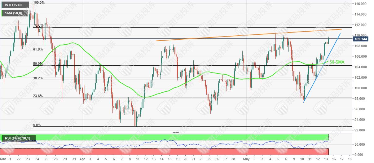 然而,4 月 18 日以来的上升倾向趋势(截至发稿时处在 111.00 美元附近)加上相对强弱指标状况,表明WTI油价将接近超买区域以测试能源价格。