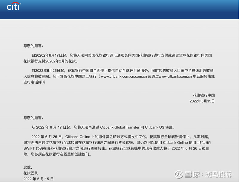 通知明确指出,自2022年6月26日起,花旗银行中国将全面停止提供全球速汇通服务,同时收款人名单中全球速汇通收款人信息将被自动移除。花旗银行中国在此提醒,请用户使用之前用于创建全球速汇通收款人的账户详细信息及以下SWIFT代码在花旗网上银行中创建SWIFT转账收款人。
