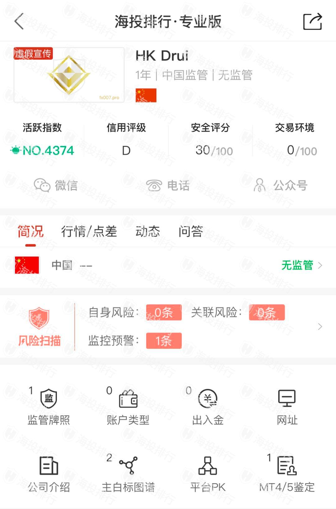 这家平台叫HK Drui,成立于2021年,全球排名4374名,目前无监管,没有外汇牌照,不能做外汇保证金交易,风险扫描显示2条风险,投资者资金安全无保障。