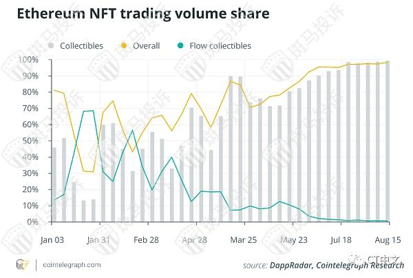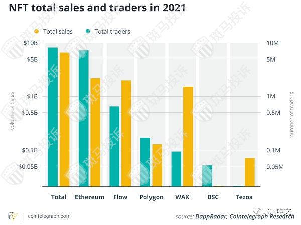 然而,尽管以太坊目前具有优势,但市场上仍有一系列重要的竞争对手。从下面的NFT总销售额和交易者的图表中可以看出,Worldwide Asset eXchange(WAX)、Polygon和Flow代表了强大的对立面。2021年迄今为止,每三个交易员就有一个使用Flow,每四个交易员就有一个使用WAX,尽管今年总销售额的近90%发生在以太坊上。