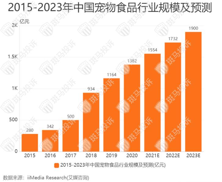 艾媒咨询数据显示,2020年中国宠物食品行业规模约为1382亿元,预计2021年相关行业规模将达到1554亿元。