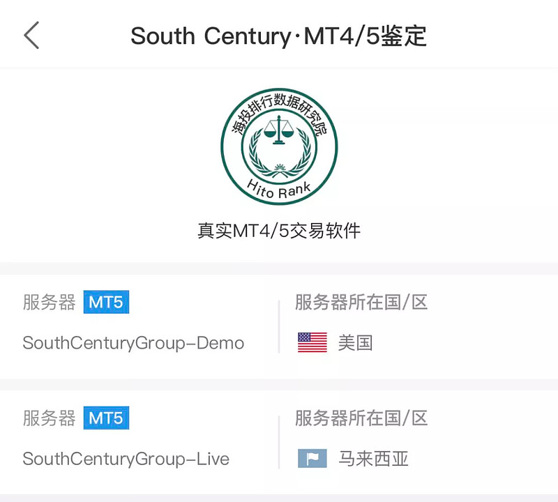 South Century有2台MT5服务器,实盘服务器在马来西亚,很有可能是马来西亚的华人诈骗团队;