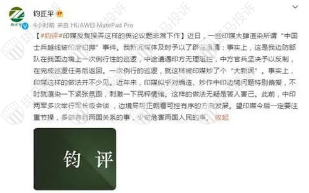 近日,一些印媒大肆渲染所谓“中国士兵越线被印度扣押”事件。我新闻媒体及时予以了辟谣澄清:事实上,这是我边防部队在我国边境上一次例行性的巡逻,中途遭遇印方无理阻拦,中方官兵坚决予以反制,在完成巡逻任务后返回。一次例行的巡逻,就这样被印媒炒了个“大新闻”。