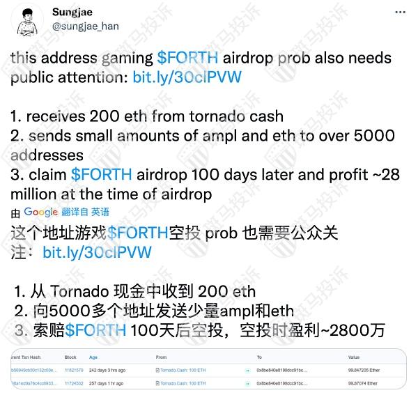 根据Sungjae的披露,至少从257天以前即今年的1-2月份时,该匿名人士经由以太坊上的隐私协议Tornado Cash上接收了200 ETH,然后给超过5000个地址发送了少量的AMPL代币(调控AMPL算法稳定币协议运行的记账代币)和ETH用以呈现交互,在AMPL协议宣布空投治理代币FORTH的100天后该匿名人士获利,仅在空投当时它就获利2800万美元。