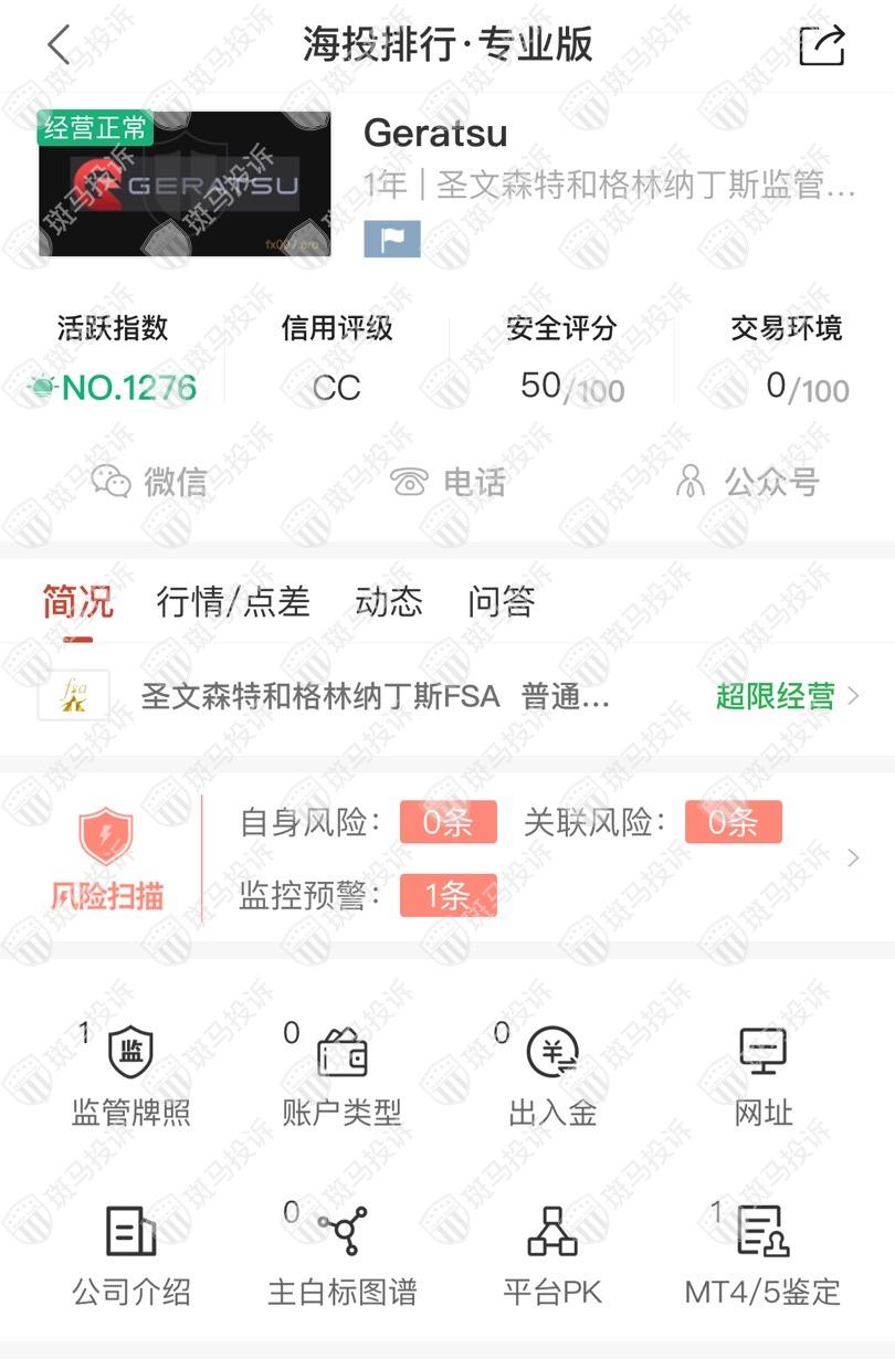 这家平台叫Geratsu,成立于2021年,全球排名1276名,目前有圣文森特和格林纳丁斯FSA监管,但是没有外汇牌照,不能做外汇保证金交易,风险扫描显示1条风险,投资者资金安全无保障。